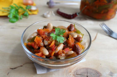 В конце приготовления отправьте в кастрюлю фасоль. Иногда перемешивая, тушите всё вместе ещё 20-30 минут. Влейте уксус и снова всё перемешайте. Заранее простерилизуйте банки и крышки от них. Подробнее об этом. а также о других нюансах консервирования читайте в отдельных статьях по ссылкам в конце рецепта.