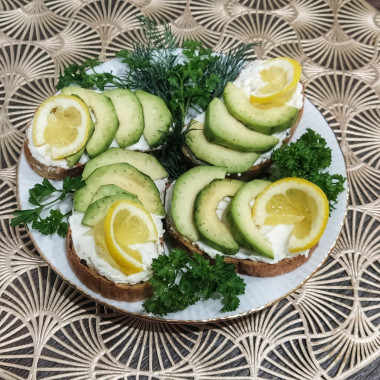 Выложите ломтики авокадо на творожный сыр. На каждый бутерброд добавьте по ломтику лимона. Посыпьте бутерброды солью и молотым перцем. Украсьте листиками салата или зеленью и подавайте к столу.