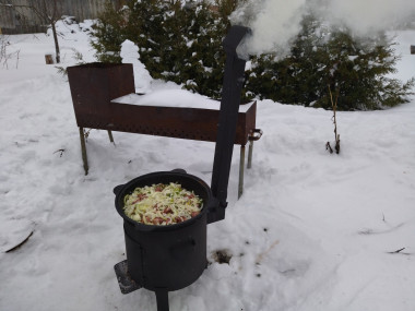 Отдых на даче даёт возможность приготовить то, что в условиях квартиры не сделаешь. Например, шашлык в казане на костре.