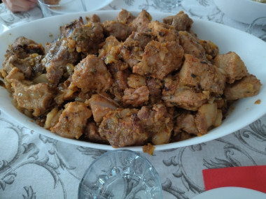 Готовьте мясо под закрытой крышкой ещё около 30 минут. Точное время зависит от объемов казана, размеров кусков мяса и жара огня. Периодически стоит открывать крышку и перемешивать мясо с луком. В конце приготовления крышку откройте и дайте выпариться лишней жидкости.
