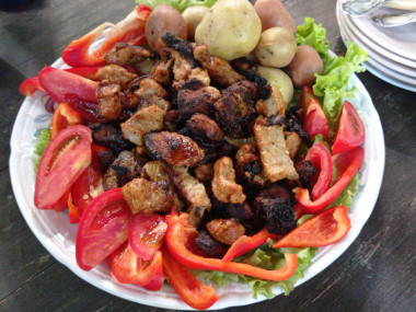 Шашлык получился сочный, в меру пикантный. Мясо пропиталось специями, вкусом лука и сала. Да и сами кусочки сала получились очень аппетитные. А в сочетании с семейными посиделками в беседке такой шашлык, приготовленный в казане, просто потрясающий.
