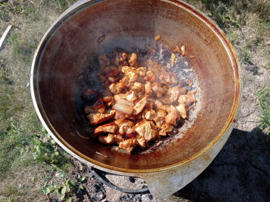 Примерно минут через 10 откройте крышку казана и с помощью шумовки слегка отодвиньте сбоку мясо и лук. Посмотрите, вытопилось ли сало. Если нет, то крышку снова прикройте на некоторое время, если же сало уже практически всё вытопилось, то содержимое казана нужно перемешать.