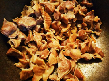 Если куриные желудочки замороженные, разморозьте их, очистите и промойте. Отварите желудки в подсоленной воде в течение 45 минут с момента закипания воды. Это нужно сделать обязательно до их жарки, иначе они будут жесткими в готовом блюде. Поскольку куриные пупки имеют специфический запах и привкус, в воду за 10 минут до конца варки можно добавить лавровый лист и пару горошин душистого перца, специи замаскируют специфический запах.