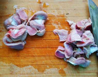 Пока жарятся овощи, вареные куриные желудочки нарежьте ножом на небольшие кусочки.