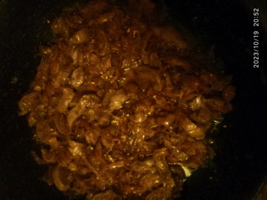 Отправьте нарезанные желудки в сковороду с овощами. Перемешайте и жарьте всё вместе в течение 10 минут. Затем добавьте соль, черный молотый перец по вкусу и иные специи по желанию.