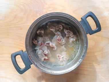 Затем воду из кастрюли слейте и дайте желудкам остыть. Пока куриные желудочки остывают, подготовьте овощи. Морковь помойте, почистите и натрите на терке.