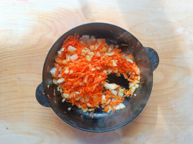 На сковороду наливаем растительное масло и разогрейте его. Обжарьте на разогретом масле морковь с репчатым луком на среднем огне в течение 5-7 минут, помешивая лопаткой, чтобы овощи пустили сок.