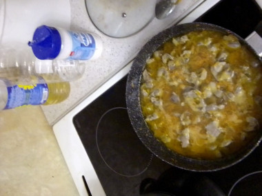 Влейте в сковороду воду, чтобы она практически закрывала содержимое сковороды. Накройте сковороду крышкой, убавьте огонь до минимального и тушите желудочки с овощами в течение получаса. В процессе тушения по желанию, например, для придания остринки и пикантности, в сковороду можно добавить немного соевого соуса, или, наоборот, чтобы блюдо получилось нежнее на вкус – сметаны.