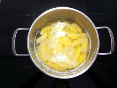 Положите картофель в кастрюлю, залейте его водой и поставьте на огонь. Посолите и доведите до кипения, после чего проварите картофель на среднем огне 7-10 минут, до полуготовности. Затем снимите с огня и полностью слейте воду. Таким образом картофель запечется одновременно с рыбой.