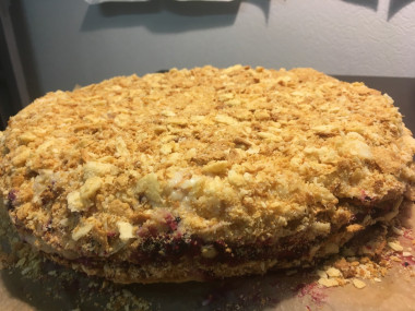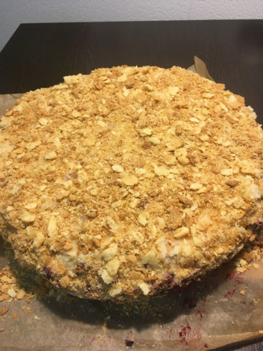 Обмажьте торт сверху и по бокам кремом и обсыпьте крошкой. И снова уберите для пропитывания. Лучше всего такому торту дать на пропитку сутки.