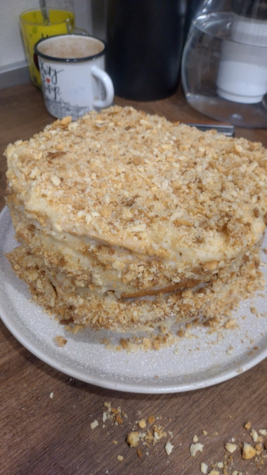Вчера слепил свой первый торт. Единственное уменьшил сахар с 370гр, до 250гр и он все равно остался сладким. Также сразу обсыпал и потом в холодильнике слегонца прижал. 12 часов пропитки хватило чтобы сухости не чувствовалось совсем. Получилось вкусно