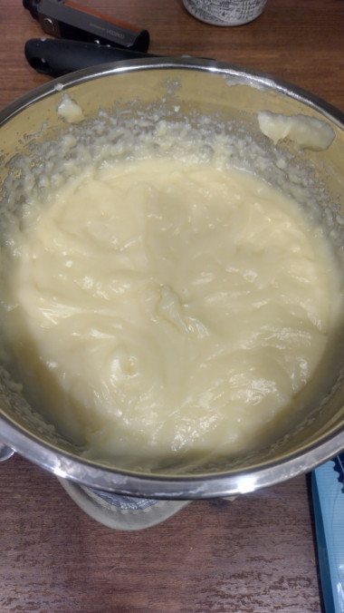 На среднем огне доведите крем до загустения, постоянно помешивая, иначе он подгорит. Готовый крем накройте пищевой пленкой в контакт и уберите в прохладное место для полного остывания. Заранее включите духовку на 190 градусов.