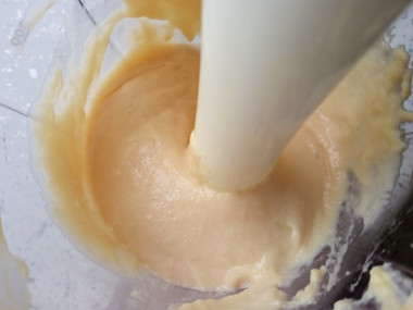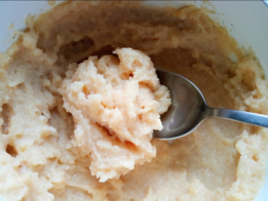 Постепенно добавляйте во взбитое масло манную кашу небольшими порциями, размешивая смесь миксером на малых оборотах.
