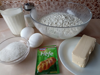 Как сделать булочки Розочки с сахаром из дрожжевого теста? Подготовьте необходимые ингредиенты. Муку используйте высшего сорта. Перед покупкой дрожжей почитайте инструкцию. В этом рецепте используются дрожжи, которые сразу смешиваются с мукой. О видах дрожжей и способах их замены читайте в статье под шагам