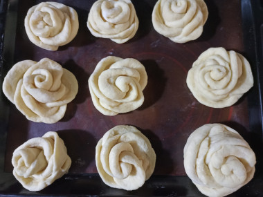 Розочки переложите на застеленный пергаментом противень срезом вниз и оставьте под полотенцем на 20 минут для подъема. Перед выпеканием смажьтие заготовки взбитым яйцом и щедро посыпьте смесью сахара и ванильного сахара. Выпекайте булочки в заранее разогретой до 180℃ духовке около 20 минут до румяного цвета. Точное время выпекания зависит от вашей техники и продуктов. Об особенностях духовок и о том как выбрать пергамент читайте в статьях под шагами.