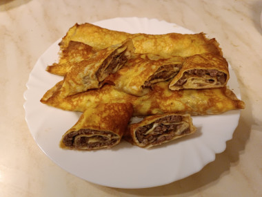 Затем снимите блинчик на тарелку, выложите на него подготовленную мясную начинку и распределите по всей поверхности. Скрутите блинчик с начинкой в рулет.
