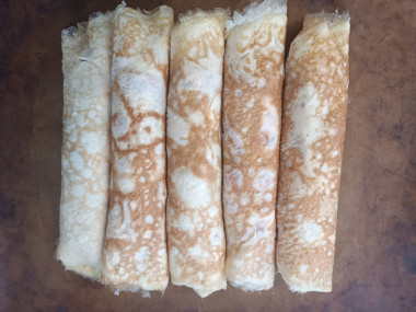 Сегодня к ужину решила приготовить, но подготовку начала днём: испекла яичные блинчики. У меня сковорода 26 см в диаметре, увеличила количество ингредиентов. Блинчики испекла на 7 яиц. У меня вышло 5 больших блинчиков.