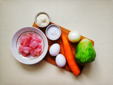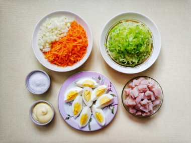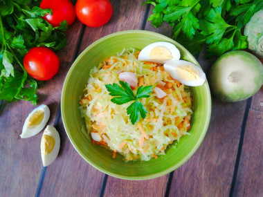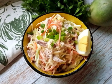Сытным салат сделали мясо (у меня была свинина) и яйца. С заправкой из майонеза получилось очень аппетитно!
