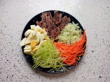 В выходные приготовила к обеду салат с редькой и мясом. Редька у меня была зелёная, она не сильно острая, но достаточно пряная. Говядину отварила заранее с вечера и оставила остывать в бульоне, чтобы мясо осталось сочным. Потом нарезала брусочками. Лук нарезала полукольцами и решила немного замариновать в яблочным уксусе с щепоткой сахара, чтобы он не был горьким. Варёные яйца разрезала пополам, а затем вдоль на пластинки. Старалась делать нарезку продуктов примерно одинаковой. В рецепте предлагается натереть морковь и редьку на корейской тёрке. Так и сделала, но подумала, что в таком виде эти овощи жестковаты. Поэтому соединила их в отдельной миске, посыпала солью и немного помяла. Так морковка с редькой стали гораздо мягче и приятнее для жевания. Салат немного поперчила, заправила сметаной и поставила в холодильник для пропитки. Салат получился сытным, вкусным, сочным, с небольшой остринкой благодаря редьке. Буду готовить его ещё не раз.