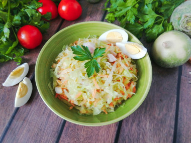 Приготовим ингредиенты. Продукты простые и доступные. Это говядина, зеленая редька, морковь, репчатый лук, куриные яйца, майонез и сметана, соль по вкусу. Вместо говядины можно использовать другое мясо, например, свинину, она более нежная на вкус, но в то же время калорийная. Говядину моем и ставим отвариваться в подсоленной воде, лучше использовать мякоть. Чтобы мясо сварилось быстрее, лучше нарезать его небольшими кусочками. Варим мясо до полной готовности, около 40 минут, с учетом количества и размера кусочков мяса. Отвариваем вкрутую куриные яйца. Пока варится мясо, подготовим остальные ингредиенты. Редьку лучше использовать зеленую, она менее горькая в отличие от черной. Редьку моем, чистим и натираем на терке. Чтобы немного смягчить острый вкус редьки в салате, можно добавить одну свежую морковку, она придаст блюду приятную сладость. Морковь моем, чистим и аналогичным образом натираем на терке. Для большей эффектности блюда, редьку и морковь можно натереть на терке для корейских салатов или нарезать ножом тонкой длинно соломкой, но это факультативно, по вкусу и желанию. Репчатый лук чистим и нарезаем тонкими половинками колец или маленькими кубиками. Отварную говядину остужаем и нарезаем ножом маленькими кубиками. Все приготовленные ингредиенты: говядину, редьку, морковь и репчатый лук кладем в салатник. Добавляем соль по вкусу. Но нужно учитывать, какую заправку для салата будем использовать. Если лишь майонез, то количество соли нужно уменьшить с учетом такой добавки. Майонез можно взять в равных пропорциях со сметаной, сметана немного уменьшает остроту салата, делает его более мягким на вкус. Можно использовать, наоборот, лишь сметану. Тогда количество соли нужно увеличить. Вареные куриные яйца остужаем, чистим и нарезаем на кусочки, напоминающие своим внешним видом дольки апельсина. Выкладываем кусочки вареных яиц на блюдо с салатом сверху. Посыпаем салат рубленной свежей зеленью и подаем его к столу. Приятного аппетита!