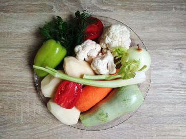 Картофель, морковку, лук очистите и хорошо промойте в проточной воде. Кабачки, стебель сельдерея, болгарский перец и помидоры так же вымойте в проточной воде. У болгарского перца удалите плодоножку и семена.