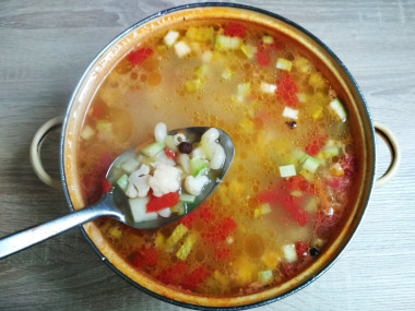 Залейте содержимое кастрюли бульоном. Бульон можно использовать любой. Если вы придерживаетесь Поста, то используйте овощной бульон, либо же обычный кипяток. Сделайте огонь на максимум, посолите по вкусу. После закипания огонь убавьте до среднего и варите суп до полуготовности картошки и остальных овощей (около пяти-семи минут).
