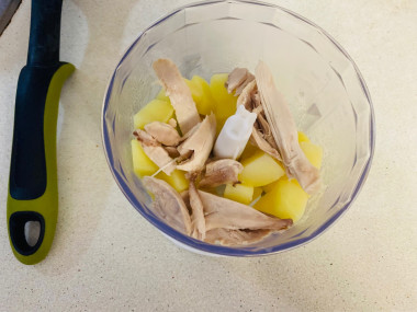 Картофель и куриное мясо перебила в блендере добавила бульон до желаемой консистенции и снова поставила на плиту на маленький огонь.