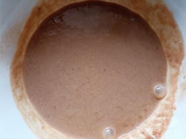 В мисочку отлейте немного ряженки, добавьте какао и все перемешайте до полной однородности. В небольшом количестве жидкости легче избавиться от комочков какао.