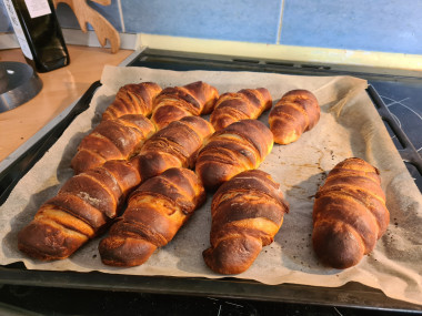 Круассаны получились, однако больше оказались похожи на булочки. Тесто не такое воздушное, как хотелось бы. Из рецепта не было ясно, сколько минут их запекать (у меня подгорели сверху, а внутри не допеклись), также непонятно каким образом намазывать масло на слои теста (растопить его?), не понятно, какой толщины и размеров пласты теста раскатывать. Тесто получилось очень липкое, невозможно было из него ничего сделать, пришлось добавить немного муки. Круассаны мы конечно съели, но во второй раз попробуем другой рецепт.