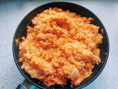 Опустите рис в кипящую воду и немного подсолите. Варите рис до готовности, согласно инструкции на упаковке. На это обычно уходит минут 20. Готовый рис станет мягкий. Можно его немного не доварить, так как он дозреет при последующем тушении. Готовый рис откиньте на дуршлаг и немного промойте водой. Оставьте рис, чтобы с него стекла лишняя жидкость.