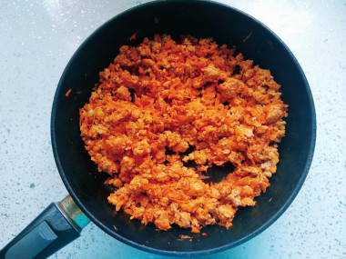 Затем добавьте на сковороду подготовленный фарш. Перемешайте его с овощами и обжаривайте все вместе минут 10, чтобы фарш изменил цвет. Точное время определяйте по своей плите.