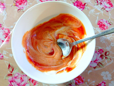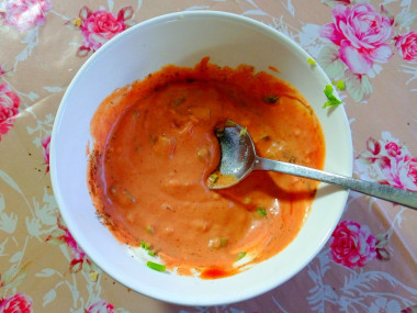 Из двух вариантов соуса для креветок в домашних условиях я выбрала второй – из майонеза и кетчупа. Вместо петрушки я добавила нарезанный зеленый лук. Чеснока положила побольше – 3 зубчика.