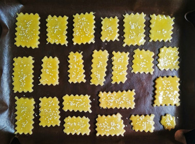 Подготовленное сырое печенье перенести на противень или форму для духовки, предварительно застеленный бумагой для выпечки. Сырой желток слегка взболтайте и кулинарной кистью смажьте поверхность печений. Посыпьте печенья тмином, крупной морской солью или оставьте совсем без посыпки. Поставьте противень с печеньем в предварительно разогретую до 180 °С духовку, выпекайте около 12-17 минут. Время выпечки будет зависеть от мощности духовки и толщины печенья.