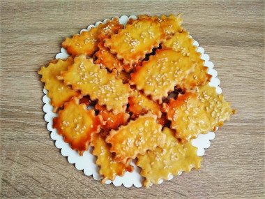 Готовое домашнее соленое печенье достаньте из духовки и дайте ему остыть. Такая выпечка прекрасно подойдёт в качестве закуски к пиву или вину. Приятного аппетита!