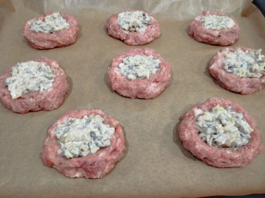 В каждое мясное гнездышко выложите подготовленную начинку. Чем больше поместится начинки, тем вкуснее получится. Поставьте мясные гнезда в духовку, предварительно разогретую до 180 градусов, на 30-40 минут. Ориентируйтесь по своей духовке.