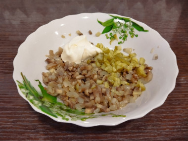 Маринованные огурцы мелко нарежьте или натрите на крупной терке. Соедините обжаренные грибы и огурцы. Добавьте творожный сыр. Можно добавить немного соли, но учитывайте, что огурцы соленые. Все смешайте.