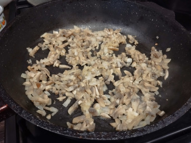 В горячую сковороду налейте немного растительного масла и выложите нарезанный лук. Обжарьте его в течение минуты до прозрачности. Затем добавьте в сковороду грибы. Все перемешайте и обжаривайте все вместе еще 5-7 минут. За это время испарится вся влага, а грибы уменьшатся в размере.
