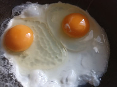 Вбейте яйца. Вы можете оставить желтки целыми или же наоборот разбить их. Обжарьте яйца на среднем огне до полуготовности. Жарятся они быстро, обычно 5-7 минут.