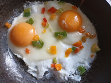 Этот рецепт базовый. Вы также можете добавить кусочки овощей: брокколи, кабачки, лук и баклажаны, - все по Вашему вкусу. Это могут быть и кусочки колбасы, сосисок и даже вчерашней недоеденной курицы или мяса. Так получится более сытный вариант. Подавайте жареные яйца с салатом из свежих сезонных овощей, или просто с помидорами черри и нарезанным огурчиком, можно и маринованным.