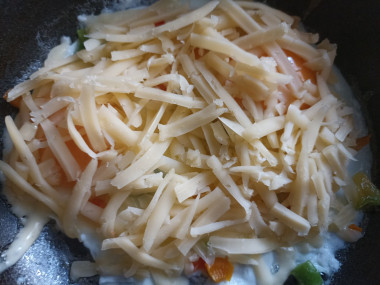 Выложите сверху на яйца сыр. Можно натереть его на терке или нарезать ножом на ломтики. Да и ломтики тоже могут быть потолще и потоньше. В этом вопросе ориентируйтесь на свой вкус. Накройте сковороду крышкой и дождитесь пока сыр расплавится.