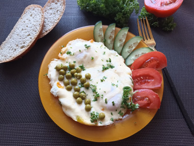 На завтрак приготовила яйца с сыром на сковороде. По совету автора в рецепт можно добавлять и овощи и мясные продукты. Я добавила немного болгарского перца ( использовала свежемороженый) , твердый сыр натерла на крупной тёрке ( впрочем и ломтики прекрасно успевают расплавится). Подавала со свежими овощами и консервированным зелёным горошком. Получилось ярко, вкусно, сытно. Позавтракали с удовольствием! Спасибо автору за рецепт!