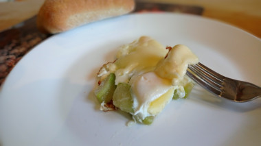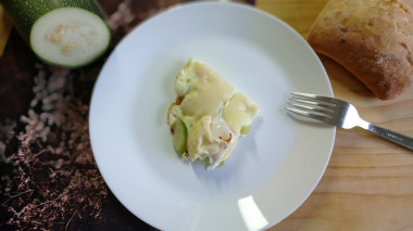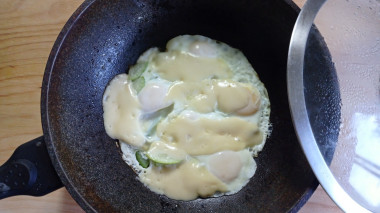 Сначала я обжарила на сковороде кусочки цуккини. Потом разбила на них пять яиц и довела их до полуготовности. Затем выложила сверху ломтики сыра. Сыра, правда, у меня оставалось не очень много, поэтому расплавленный сыр не покрыл всю яичницу.