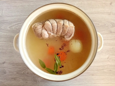 Снять кастрюлю с огня, оставить мясо в бульоне до полного остывания. За это время мясо хорошо пропитается пряностями.