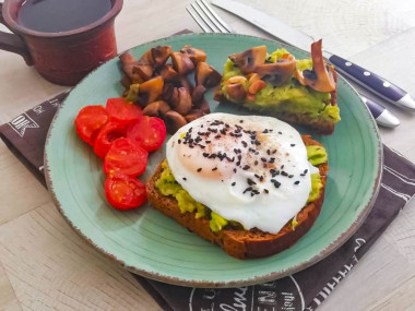 Авокадо люблю и готовлю на завтрак часто. Этот рецепт один из самых любимых и ходовых. Использовала ржаной тостерный хлеб. Подавала со слегка поджаренными на сковороде помидорами черри. Сверху готовое яйцо посыпала черным кунжутом и вкусно, и красиво. С поджаренными шампиньонами получается более сытно. А еще мне нравятся такие тосты с жареным арахисом. Автору спасибо за шикарный завтрак!
