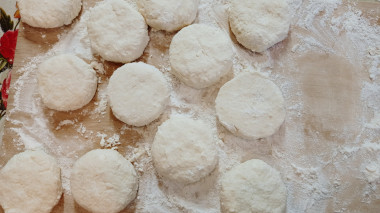 Для формирования творожников я не стала катать колбаску из теста. Просто руками делала творожные шарики, обваливала их в муке и формировала из них ровные шайбочки. У меня получилось 12 штук весом примерно 55-60 граммов каждый.