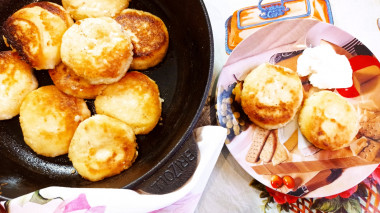 Готовила творожники сразу на двух сковородах, поскольку все они сразу не уместились в одну большую. Обжаривала творожники примерно по три минуты с каждой стороны на умеренном огне. В духовке я запекала их в чугунной форме.