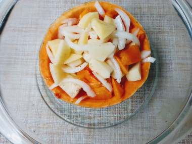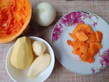 взяла не большую тыкву, с фрезала в ней часть мякоти и порезала её квадратиками. Так же порезала картошку, а лук полукольцами.