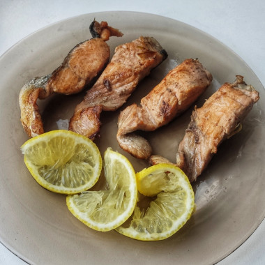 Я подавала лосося с дольками лимона. В качестве гарнира был салат из свежих овощей с оливковым маслом.