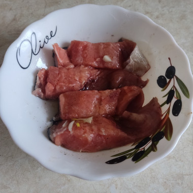 Дольку чеснока я порезала крупно,смешала с маслом,солью и смесью перцев. В конце добавила лимонный сок и перемешала. Кусочки рыбы положила в маринад, накрыла плёнкой и убрала в холодильник на 1 час.