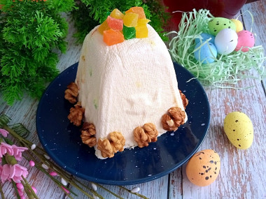 Это простой вариант приготовления праздничной пасхи. Хорошего качества творог, изюм и орехи - вот основные ингредиенты для приготовления простого праздничного десерта.